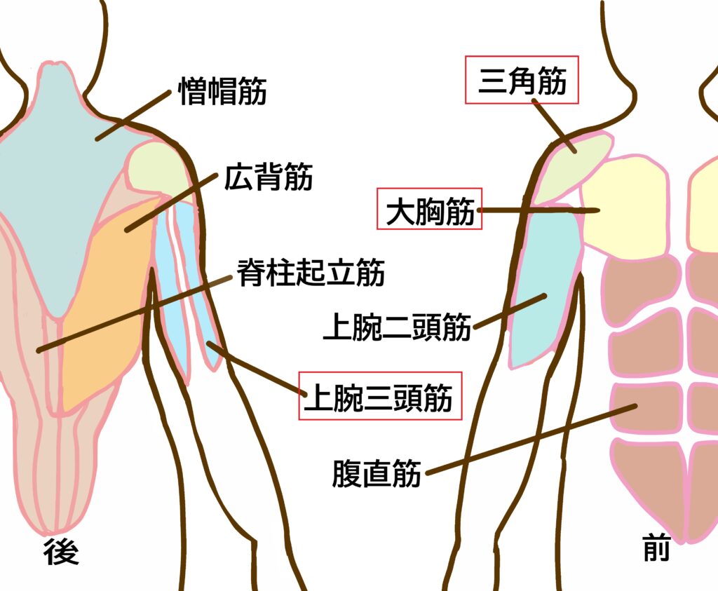 • 三角筋:腕の付け根の盛り上がっている肩の筋肉