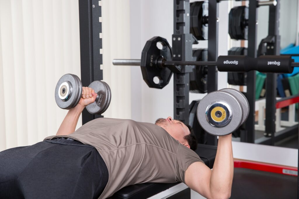 ベンチプレスと同様の方法で、バーベルを持って行うというだけですが、慣れないうちはバランスを崩しやすいので軽めのダンベルから始めて徐々に重くしていきましょう。