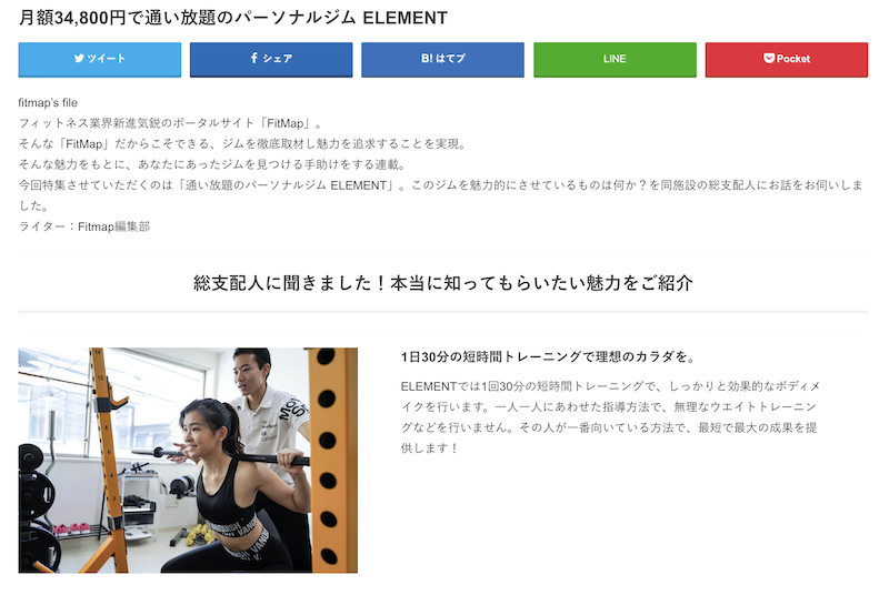ジム検索サイトFitMapが運営している特集メディア「FitMapマガジン」に弊社ELEMENTが特集されました!下記リンクより、当施設の魅力や責任者メッセージをご覧いただくことができますので、ぜひご覧くださいませ。