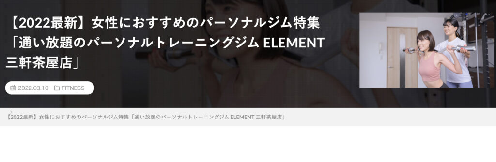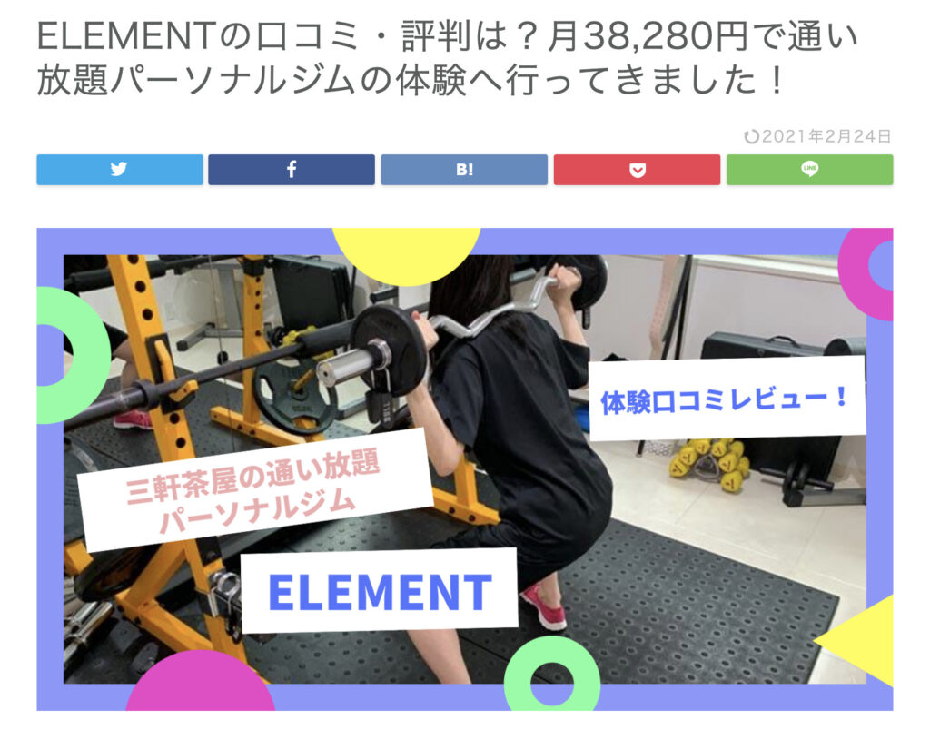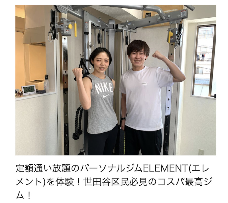 「【本音レポ】エレメントの体験・無料カウンセリングを受けてきた!トレーニングの感想や予約について紹介」「【動画あり】池尻大橋のセミパーソナルジム「エレメント」を体験してきた!トレーニング内容も解説」