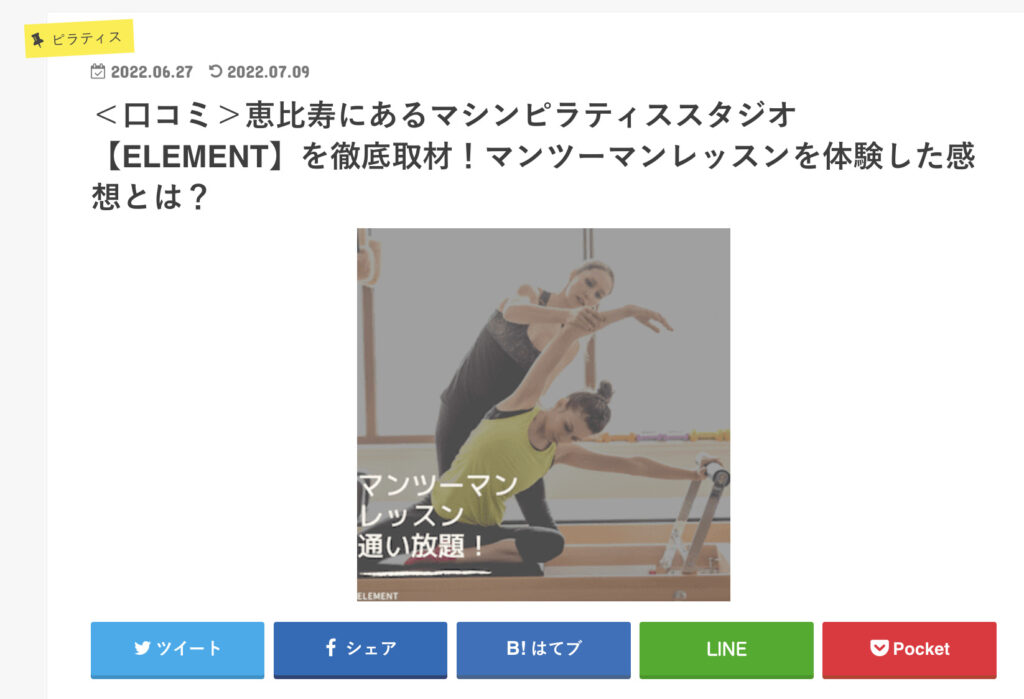 YOGA PILA LAB様の「恵比寿にあるマシンピラティススタジオ【ELEMENT】を徹底取材!マンツーマンレッスンを体験した感想とは?」に掲載いただいております!
