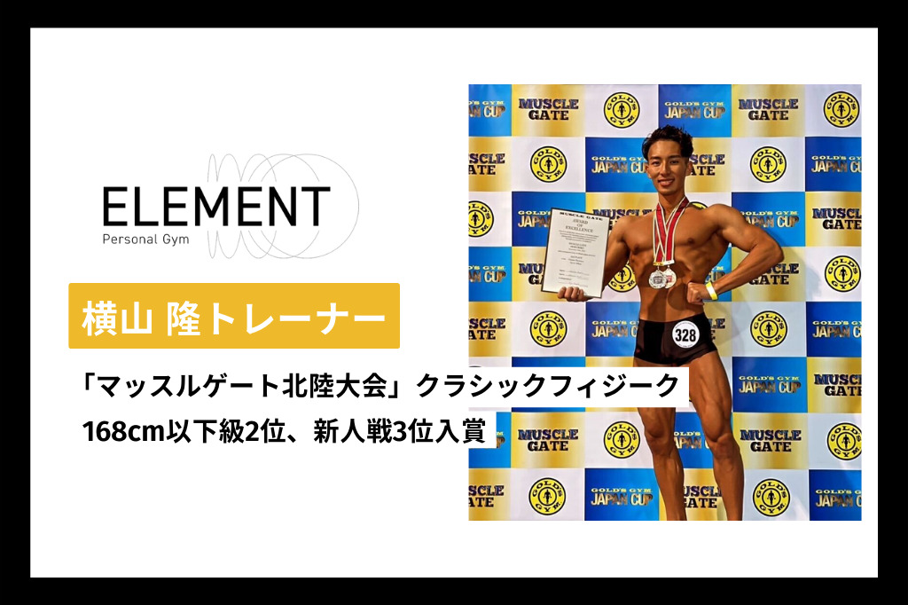 月額39,800円で通い放題のパーソナルジム 「ELEMENT(エレメント)」を都内にて展開する株式会社MIGRIDSは、この度ELEMENT 太子堂店に所属する横山 隆トレーナーが「マッスルゲート北陸大会」クラシックフィジークにて168cm以下級2位、新人戦3位入賞しましたことをお知らせいたします。