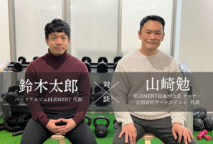 鈴木太郎(以下、鈴木):これまで入社を希望された全ての方の面談をしてきましたが、ELEMENTにマッチするなと感じる方は、トレーナーとしてのビジョンが合致している方が大多数です。短期間のダイエット・ウエイトトレーニングだけでなく、その先にある「運動の習慣化」を通じて30-40年後を変えていきたいという他にはないミッションを掲げているからこそ、そこに共感して応募いただける方が多いですし、今活躍しているメンバーも同じ目標をもって日々お客様に向き合ってくれています。二人がこのビジョンに共感して入社をしてくれたということを改めて聞けてとてもうれしいです。
