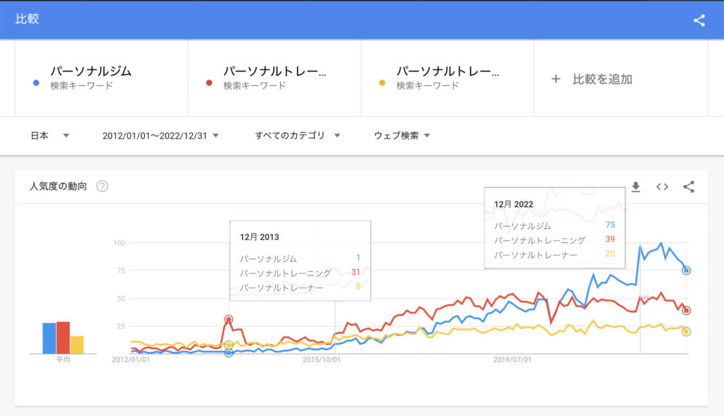 2014年のライザップの躍進によりパーソナルジムが広く知られるようになり、現在ではパーソナルジムやトレーニングという言葉が広く認知されました。(下図参考)