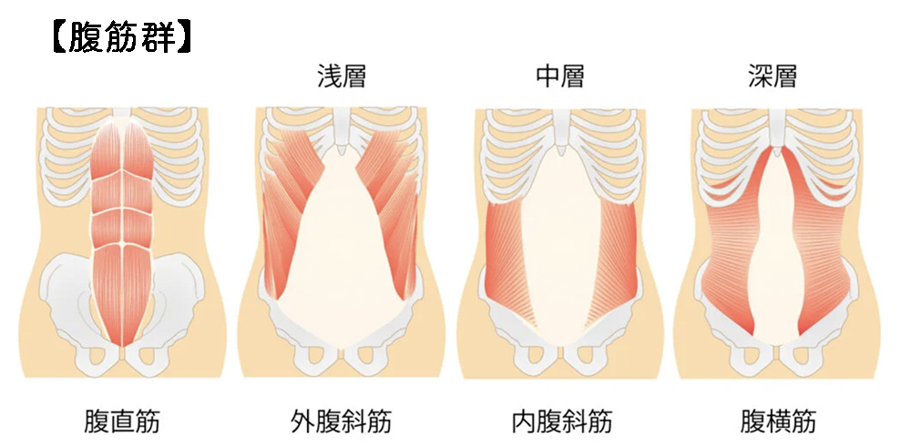 また、天然のコルセットとも呼ばれる腹横筋は、腹式呼吸時に腹腔内圧を高め、お腹を凹ませる働きがあります。