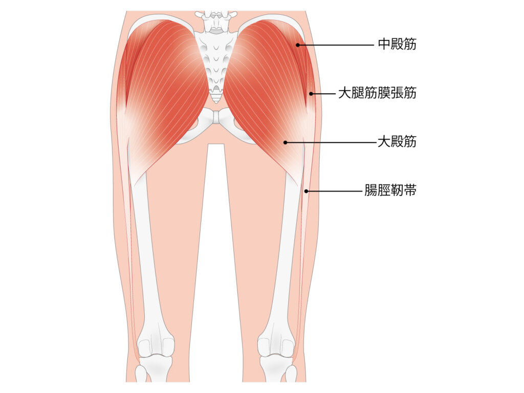 お尻の横に位置する中殿筋は股関節を外側に開く動きに関わり、立ち上がったとき膝が外側にぐらつくのを抑えケガなどを防ぐ役割も持っています。