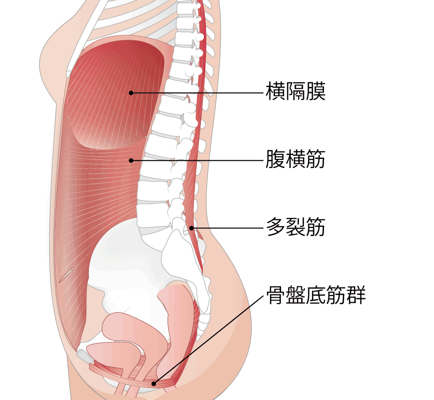 胸腔と腹腔の両域にある横隔膜、骨盤を支える骨盤底筋、背骨につく小さな筋肉・多裂筋、腹直筋の深層部にある腹横筋の4つが一般的にインナーユニットと呼ばれ、体幹強化の重要な鍵を握ります