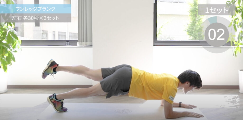 片足を上げた時、脚を高く上げ過ぎたり、腰を反らないようアライメントに注意すると腰を痛める心配がありません。プランク中は腹筋の力を抜かず、頭〜踵が一直線になる意識で行うとさらに効果的です。