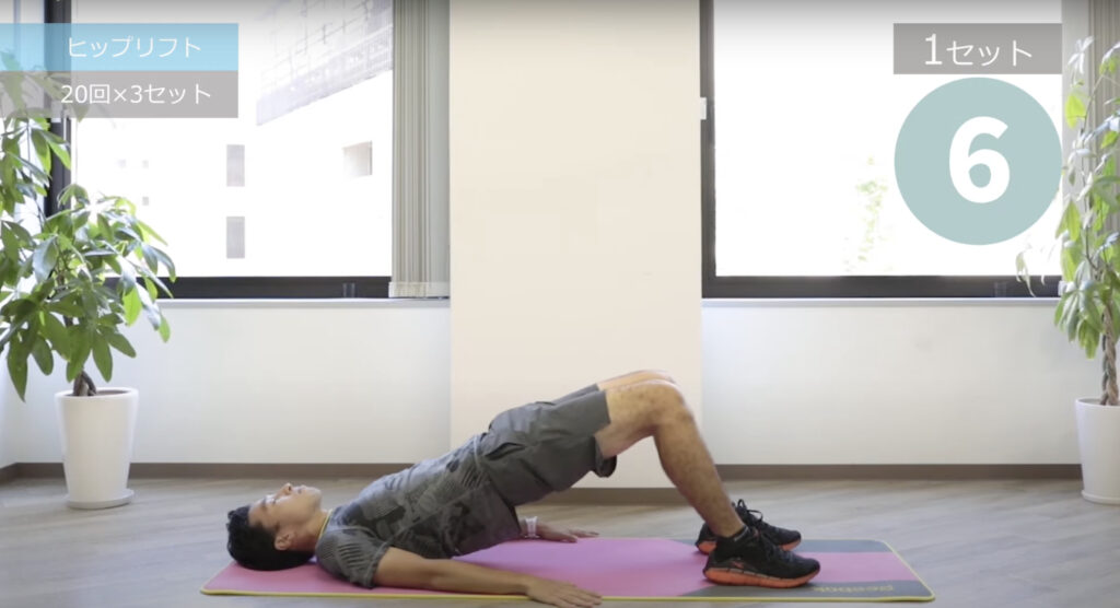 仰向け状態で腰を水平に昇降させる至ってシンプルな動作ですが、初心者さんでも取り組みやすい体幹トレーニングで非常におすすめです。