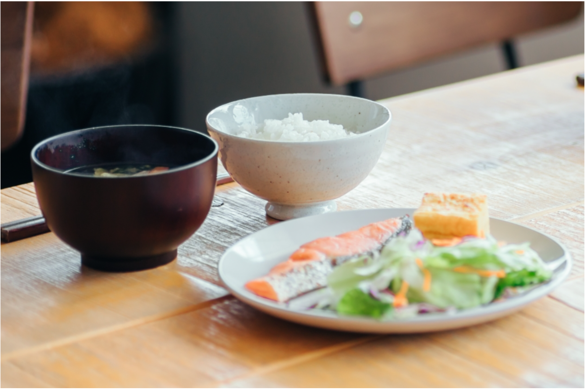 タンパク質は、肉・魚・卵・大豆製品に多く含まれているので、メインに焼き魚や卵焼きを選択し、野菜を入りのお味噌汁をくわえた和食はバランスが良いです。